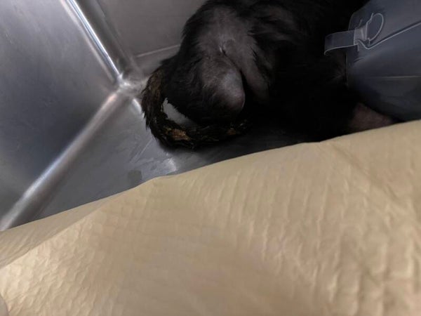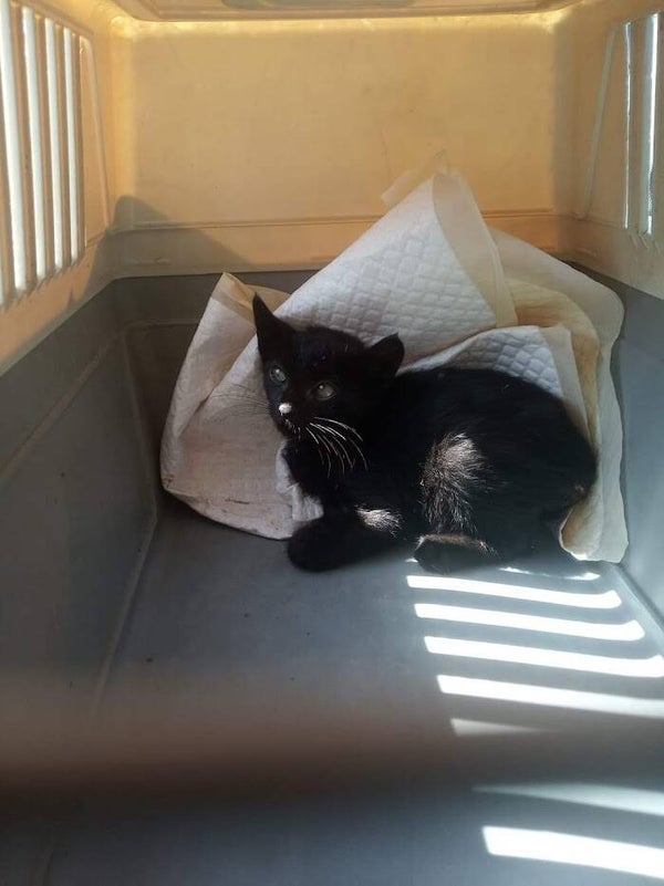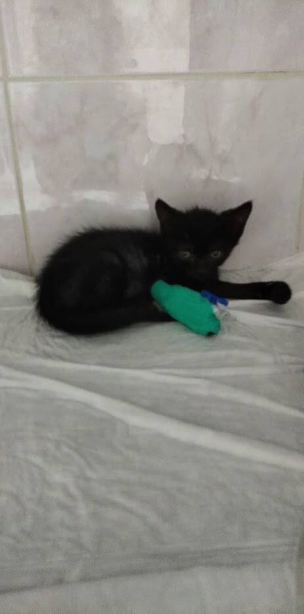 Eine ältere Frau fand ihn in furchtbarem Zustand. Sein Bauch war stark angeschwollen, sein Bein dick, er konnte kaum laufen.